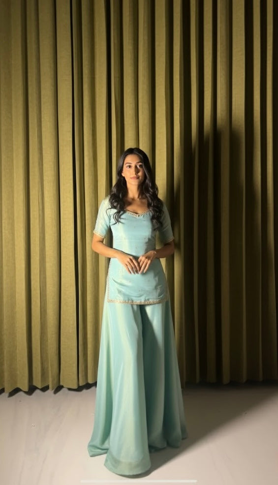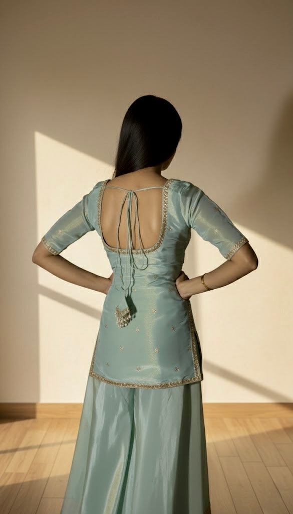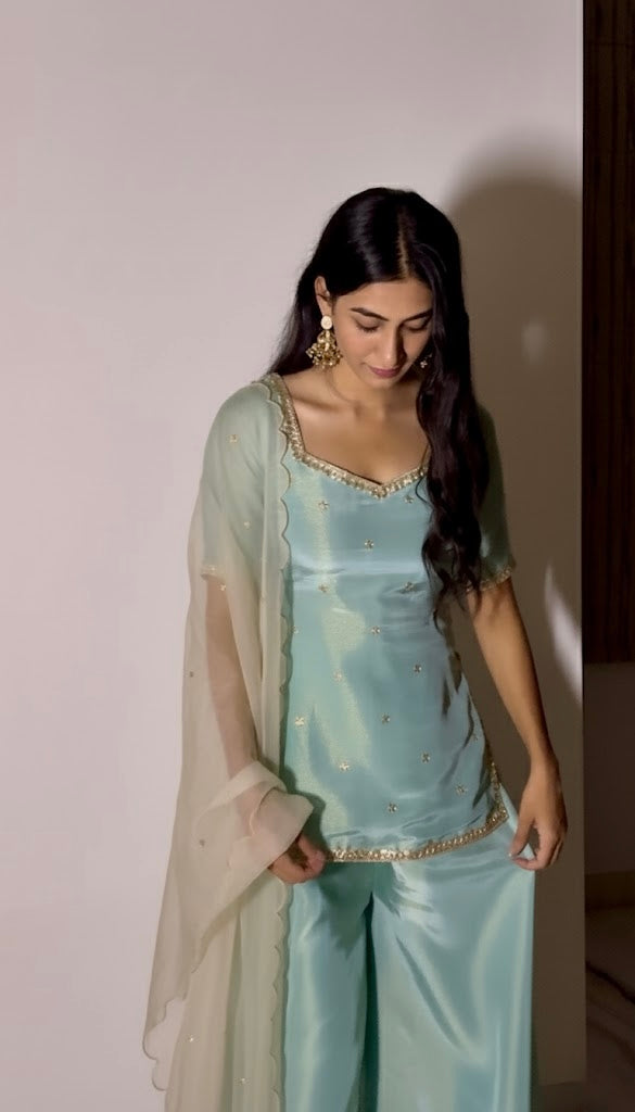 A powder blue luxe finish suit with delicate zari highlights. Calm, graceful, and made for celebrations.