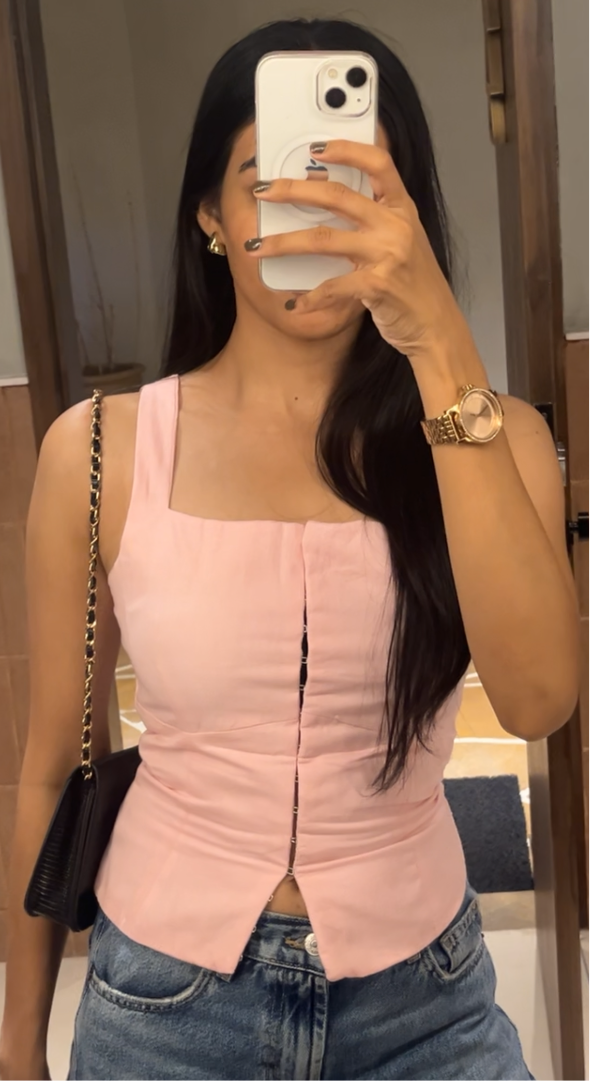 Feminine without being fragile this soft pink top gives structure and grace in equal parts.