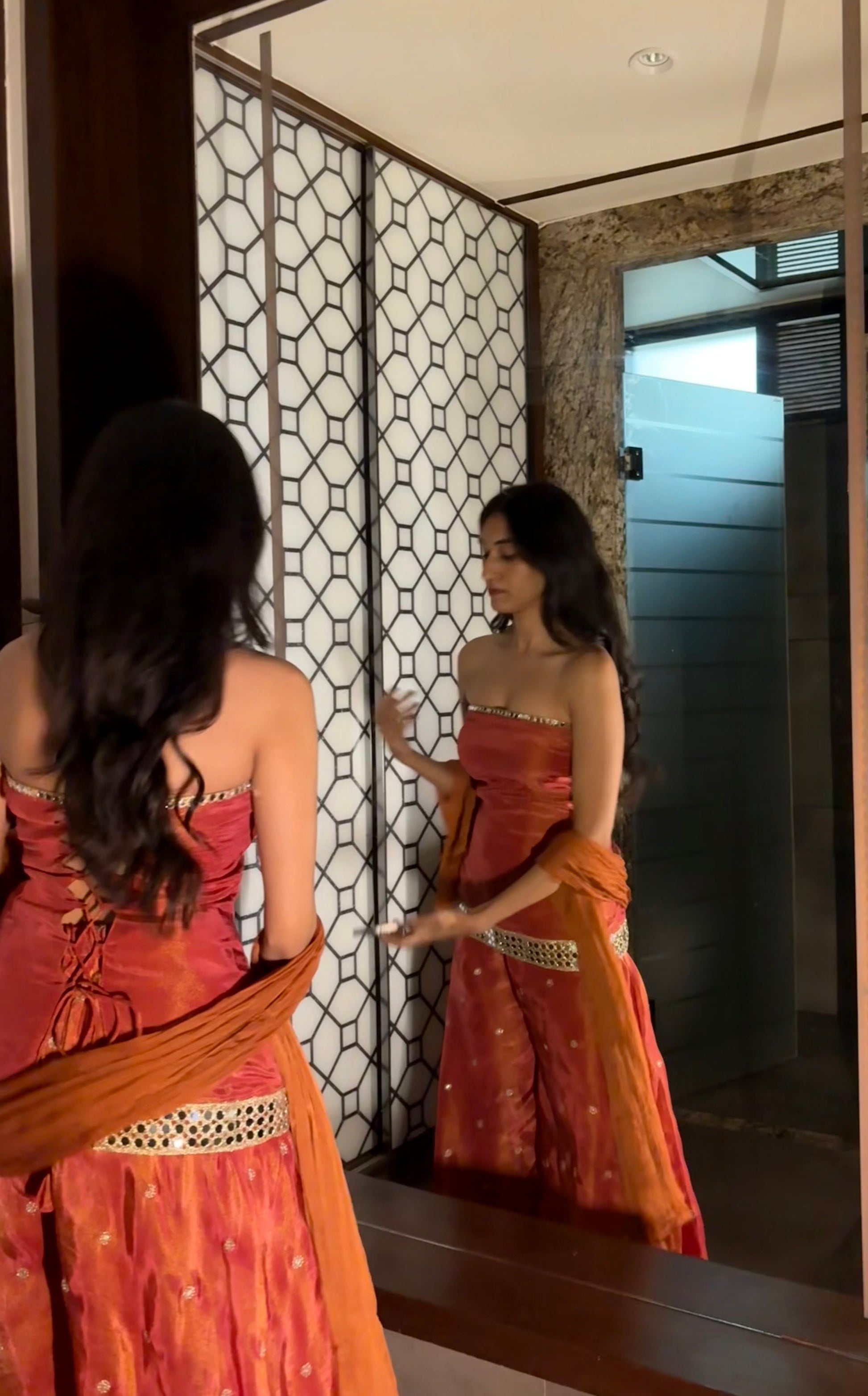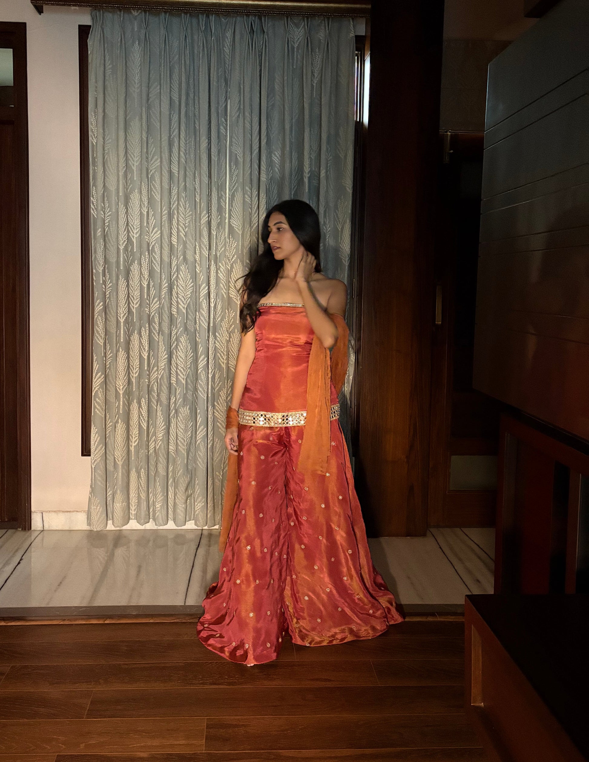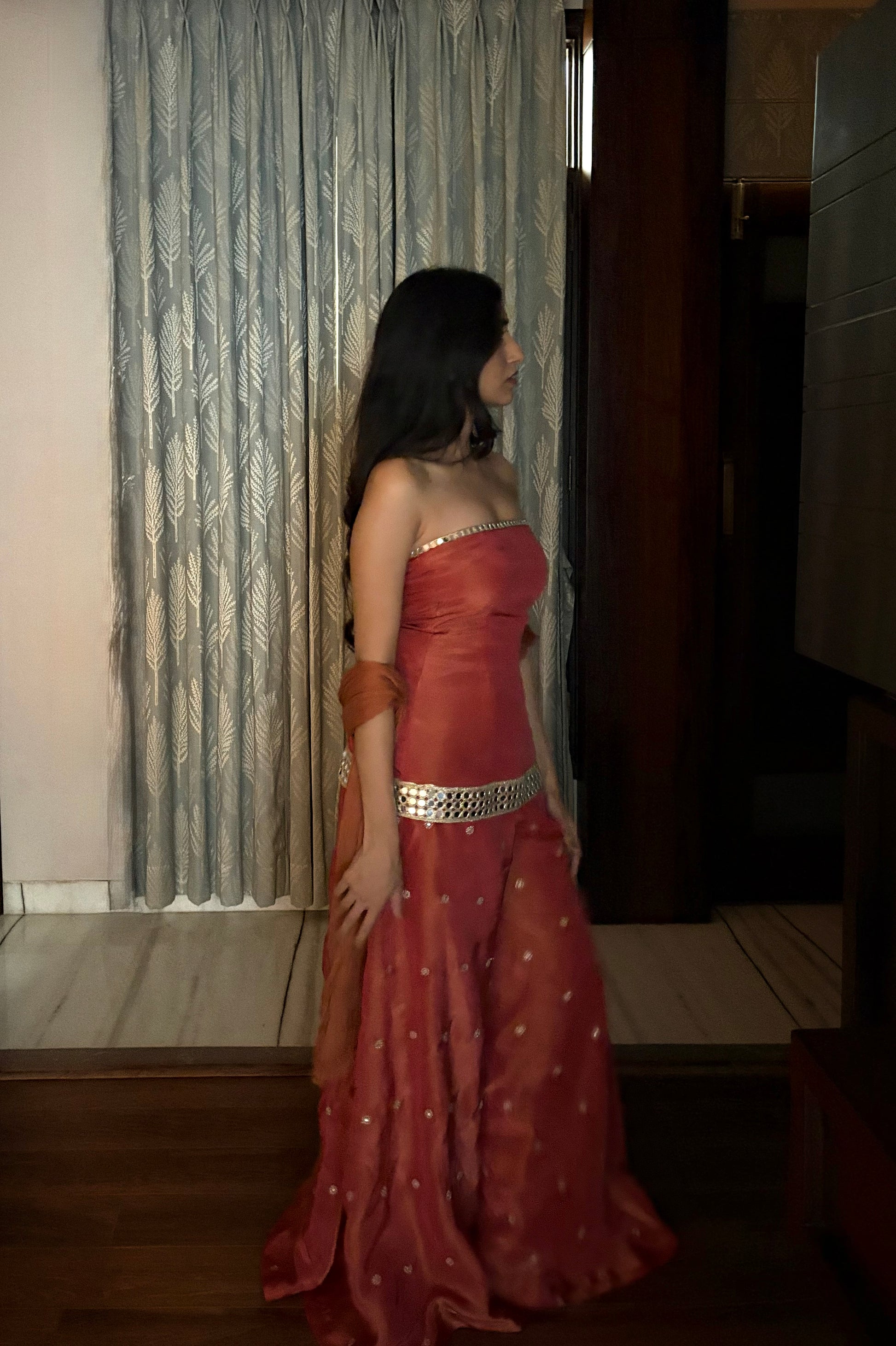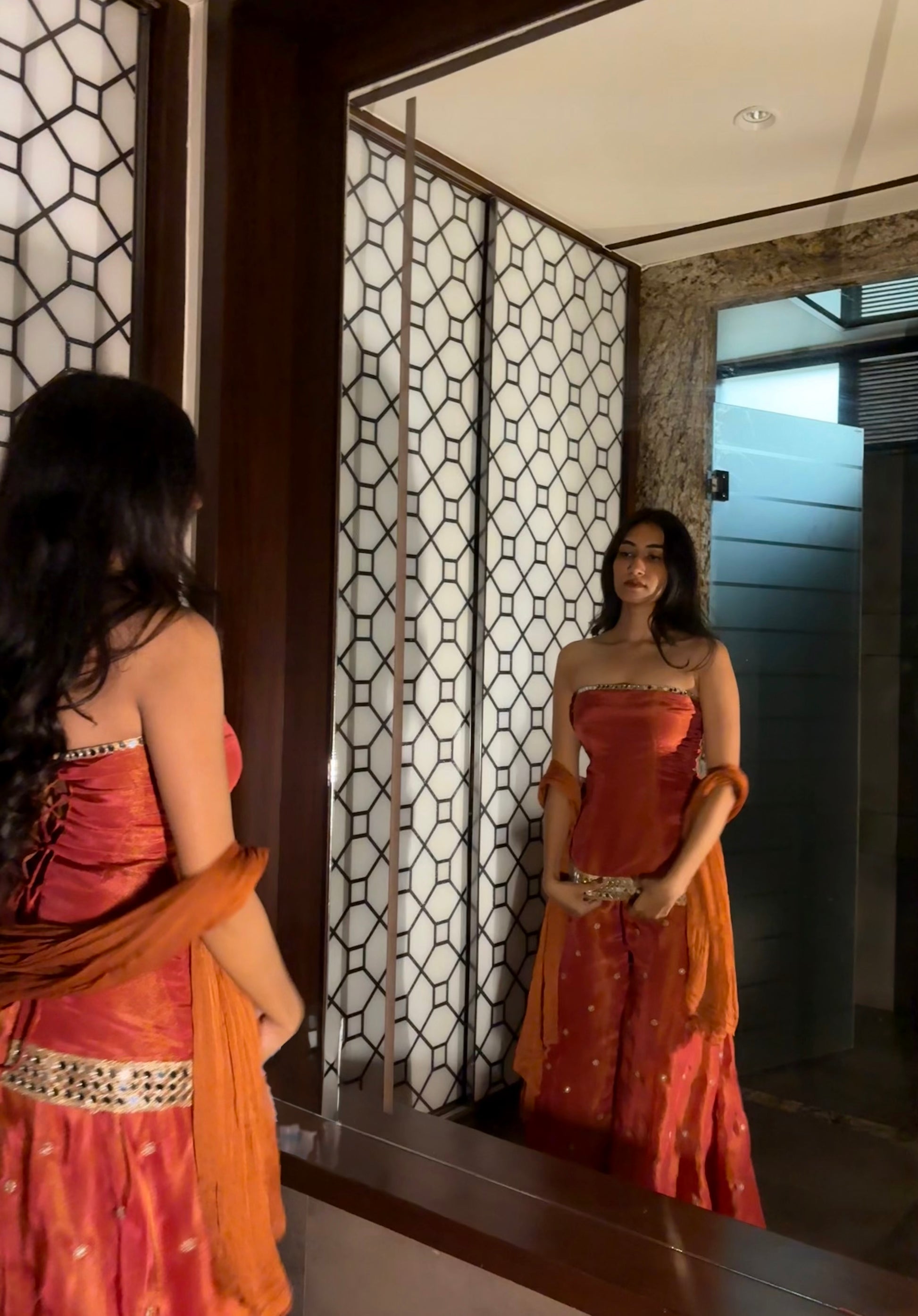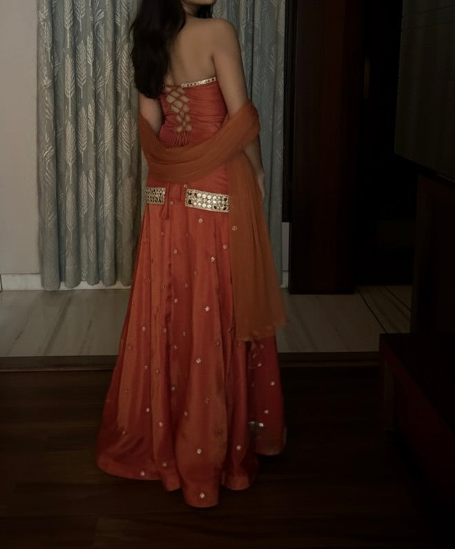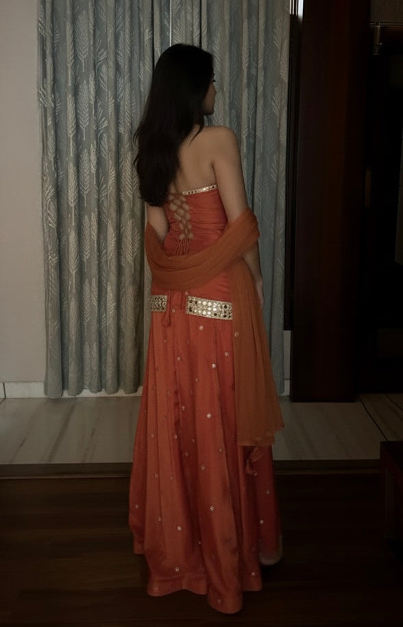 A bold orange corset silhouette with mirror accents, made for party nights, festive moods, and standout moments. Suit set includes 1 kurta, 1 pant, and 1 dupatta.