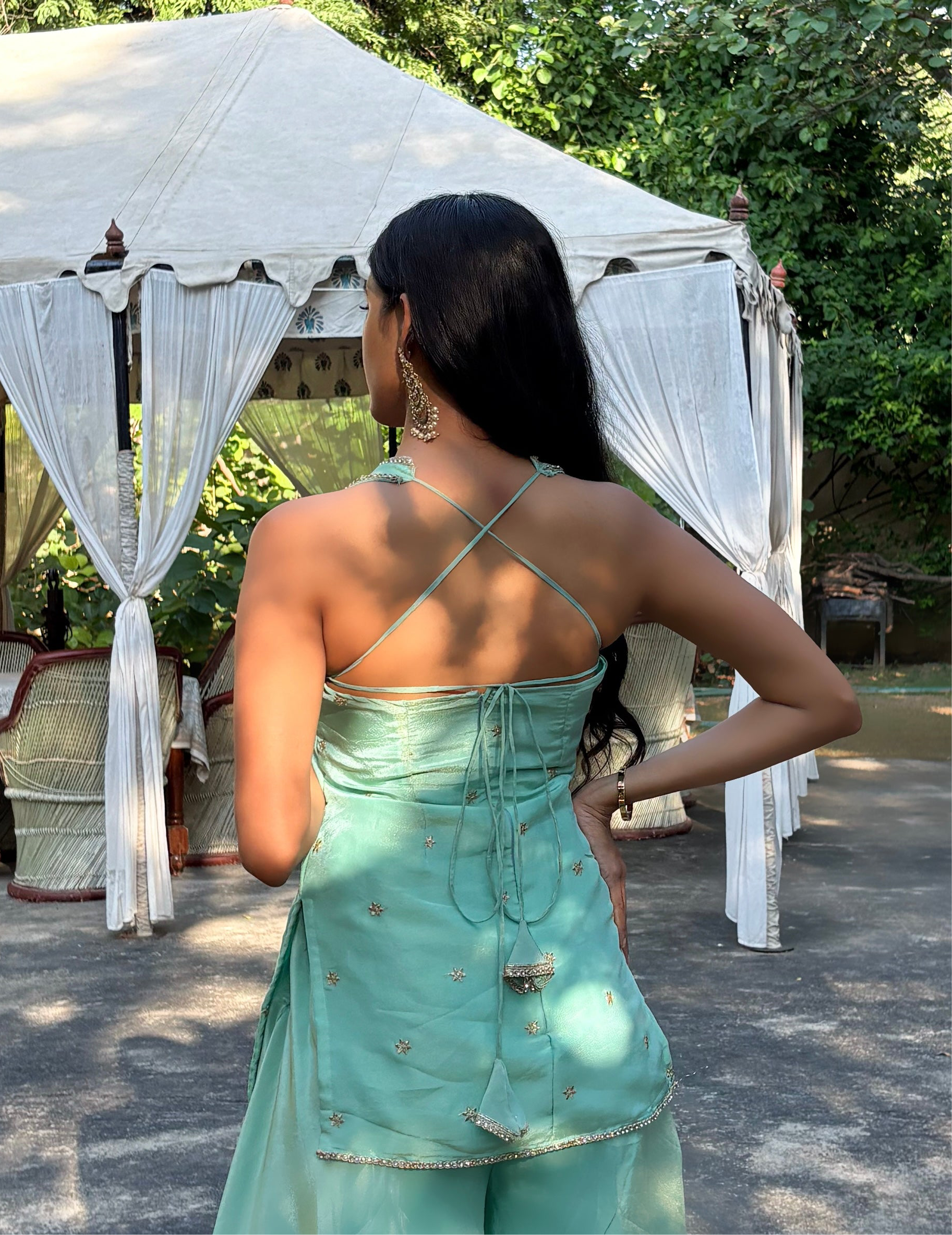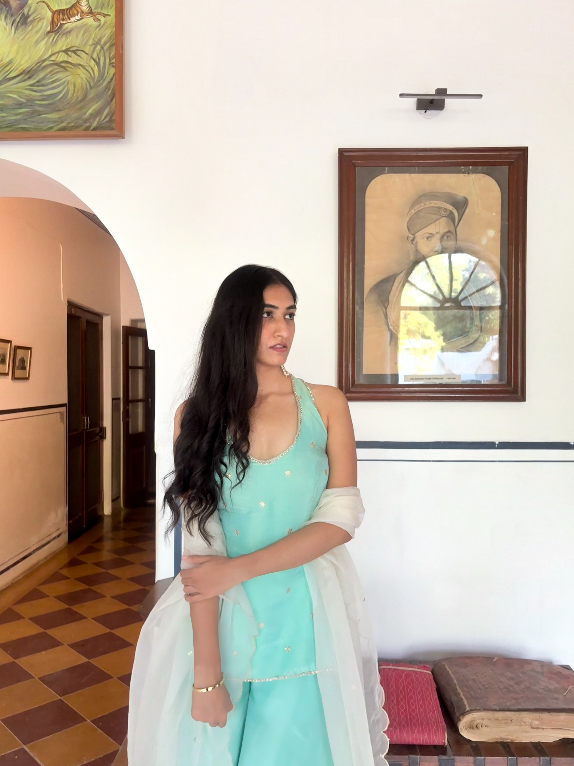A premium sheen tara suit set with delicate zari work. Sophisticated, timeless, and festive.