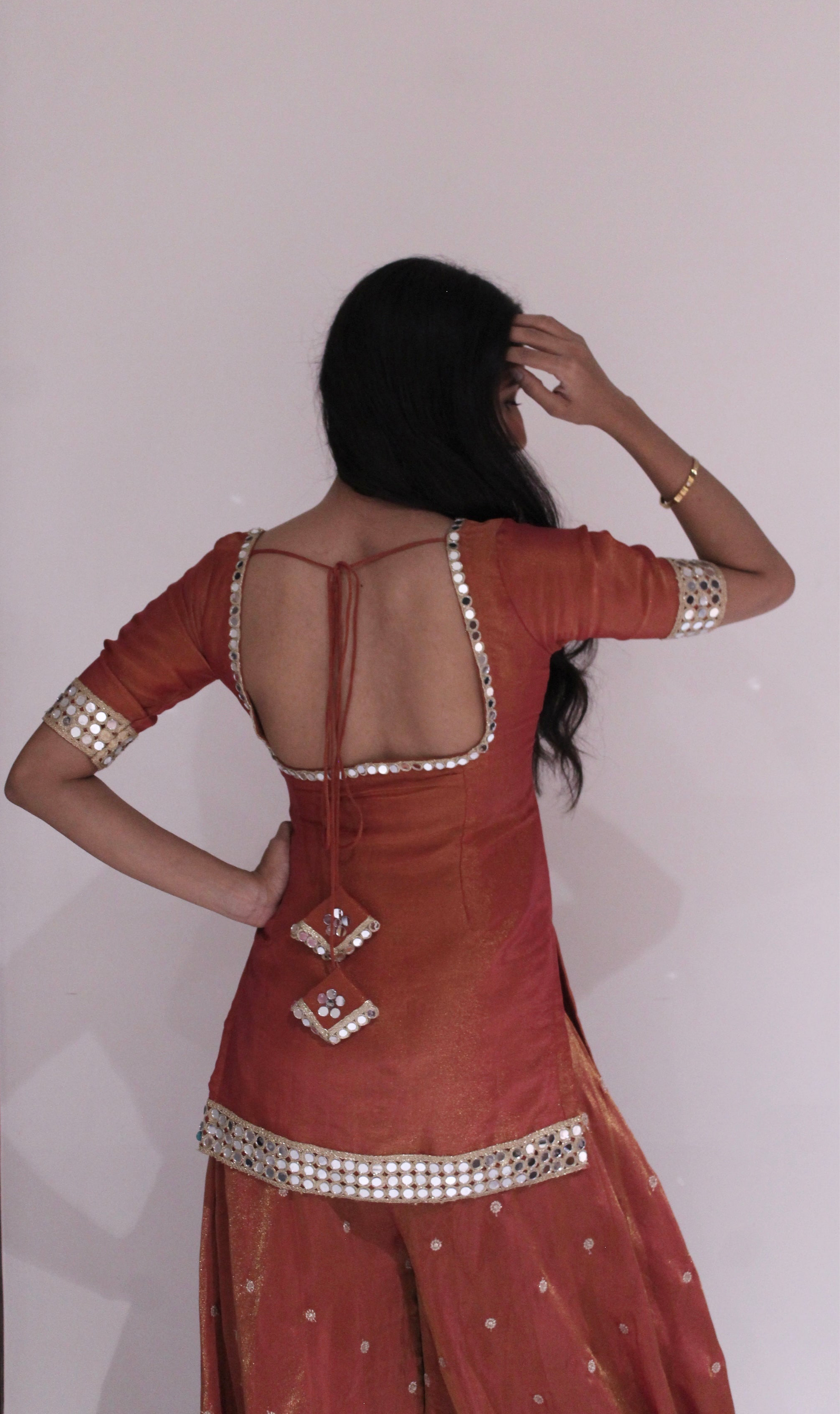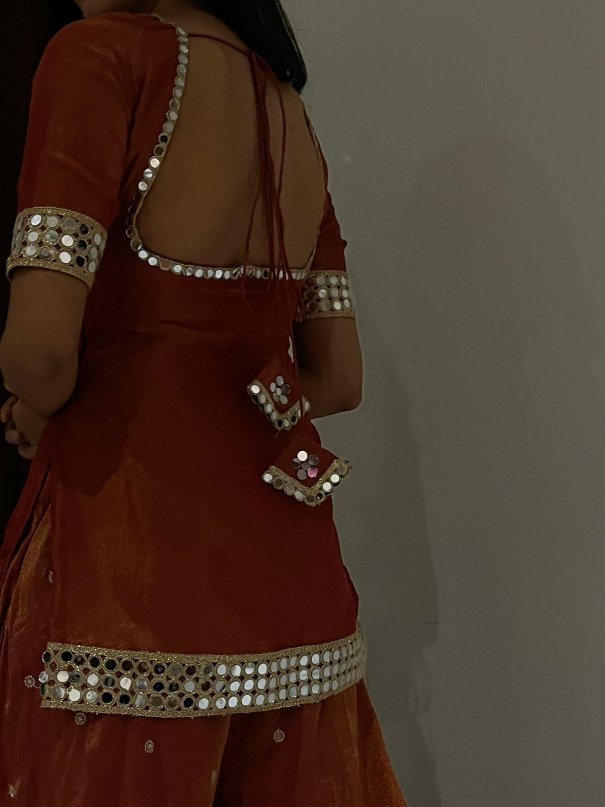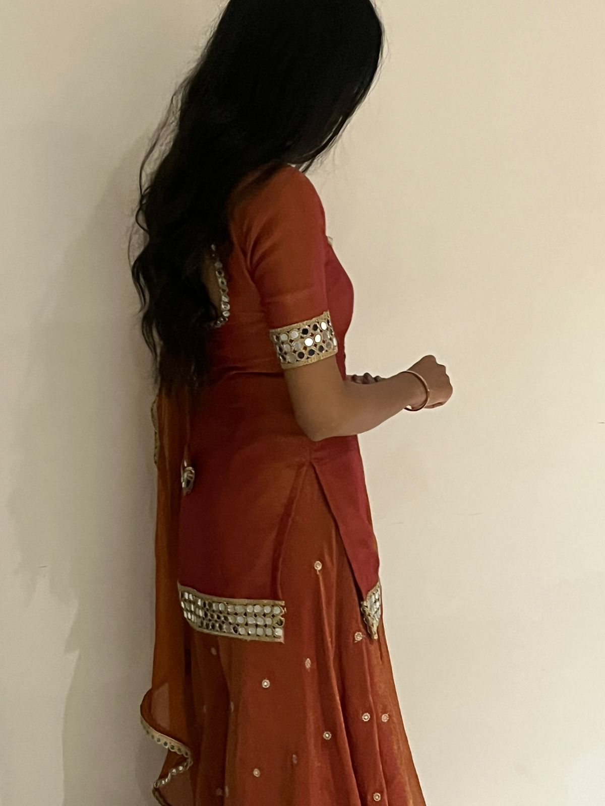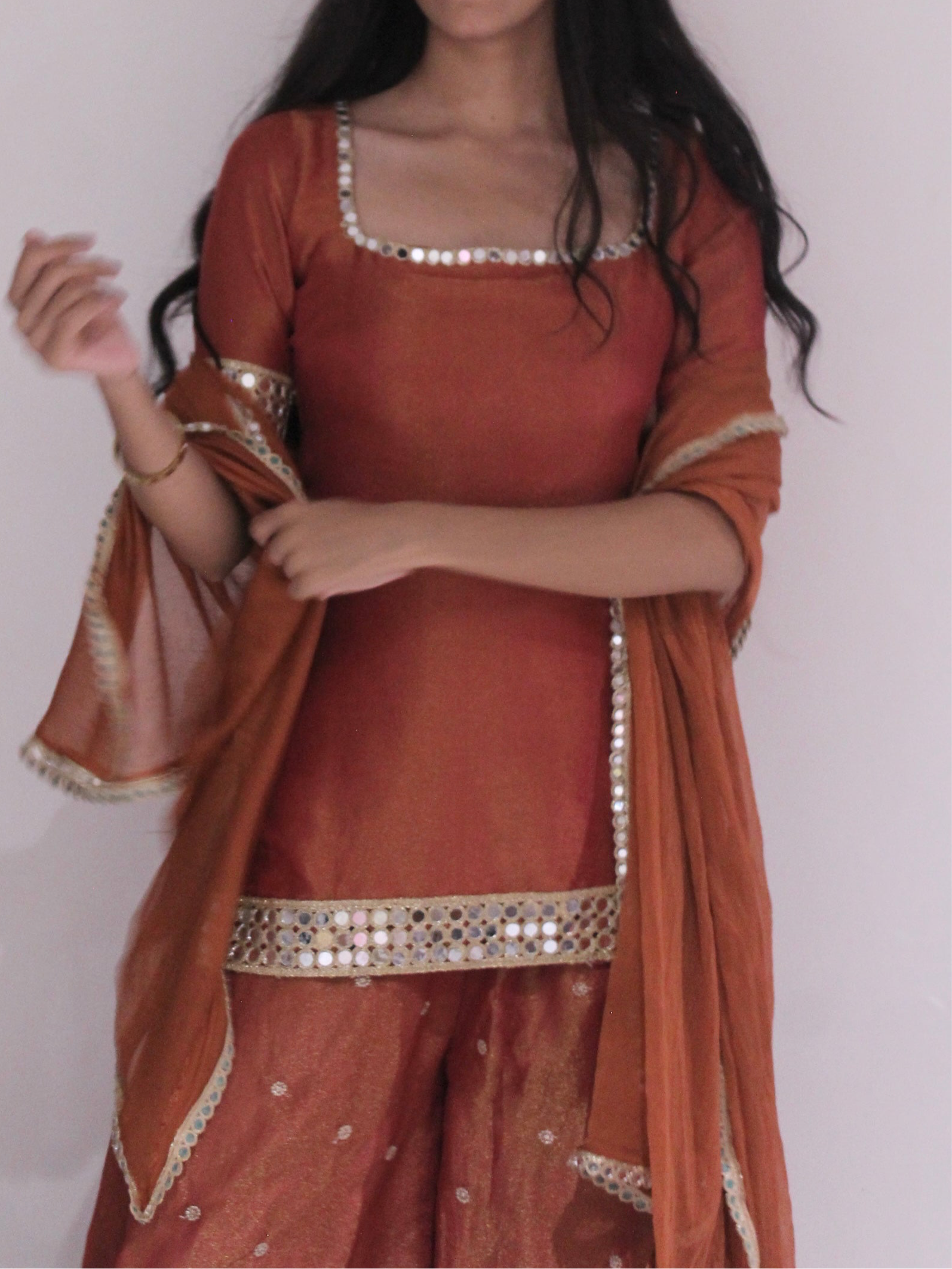 A vibrant carrot-orange luxe sheen suit with zari accents. Fresh, youthful, and full of festive charm. Suit set includes 1 kurta, 1 pant, and 1 dupatta